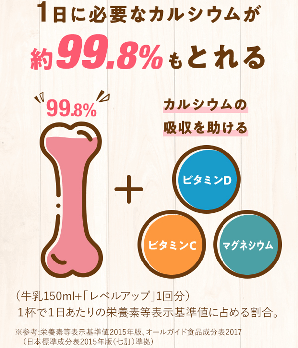 レベルアップなら、一日に必要なカルシウム量の99.8%と、吸収を助ける栄養素がたった1杯で補えます!